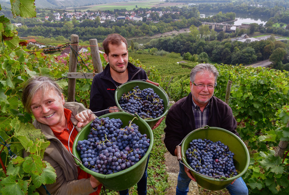 Diese Woche haben Karin Klein und ihre Helfer Paul Köhler (Mitte) und Werner Flumm Trollingertrauben auf dem Walheimer Berg gelesen.