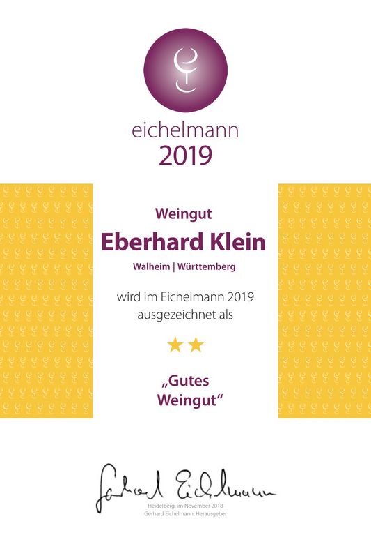 Mit der neuen Kollektion schließt Eberhard Klein nahtlos an die guten Vorjahre an, Weiß- und Rotweine sind gleichermaßen stark. Wobei nur zwei Weißweine vorgestellt wurden, beide aber sind sehr gut: Der im Holz ausgebaute Grauburgunder besitzt Fülle und Kraft, reife reintönige Frucht, gute Struktur und Substanz, die relativ alkoholreiche und also recht trockene Riesling Auslese des Jahrgangs 2015 zeigt feine Reife, besitzt viel Kraft und Substanz. Der Trollinger ist frisch, klar und geradlinig, der Zweigelt punktet mit reintöniger Frucht, mit guter Struktur und Frische, die rote Cuvee ist fruchtbetont, geradlinig und klar. Der Spätburgunder zeigt intensive Frucht im Bouquet, ist klar im Mund, frisch und zupackend, besitzt gute Struktur und reintönige Frucht. Der im Barrique ausgebaute Lemberger zeigt feinen Duft, ist klar‚ geradlinig, noch recht jugendlich. Der Merlot glänzt mit reintöniger Frucht und feiner Frische, ist strukturiert, zupackend, ebenfalls noch sehr jugendlich.