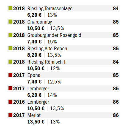 86 | 2018 Lemberger trocken Holzfass | 13,5 % | 6,20 € 😀 |